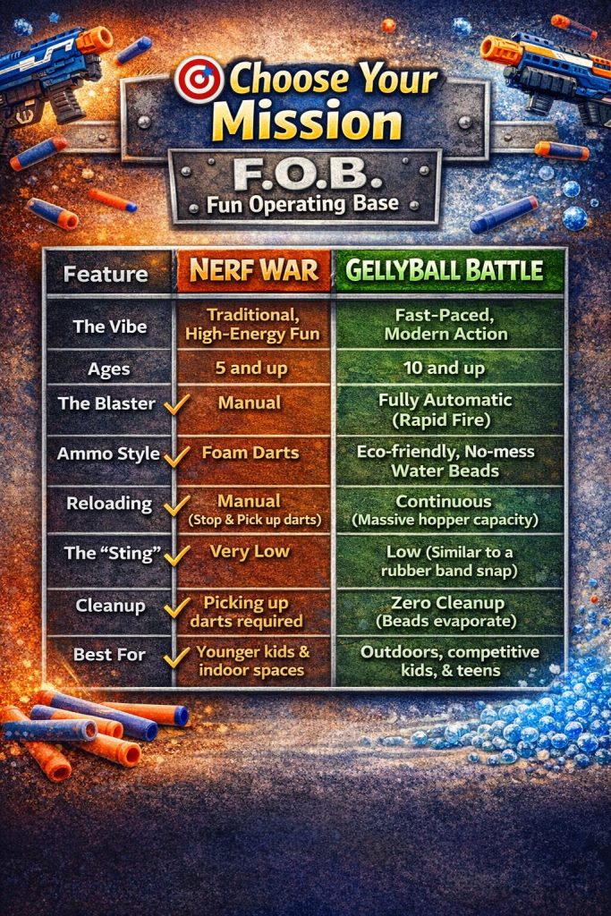 Fun Operating Base use GellyBall Blasters. GellyBall Blasters shoot a soft gel ball, much like an Orbeez that your kids probably already play with! Shot from easy-to-use Blasters, the soft GellyBalls bounce off kids or simply disintegrate, leaving no stain, mess or sting. With Nerf guns players just have to reload with ammo off the floor, which make both options great for the younger crowd of ages 5 and up!